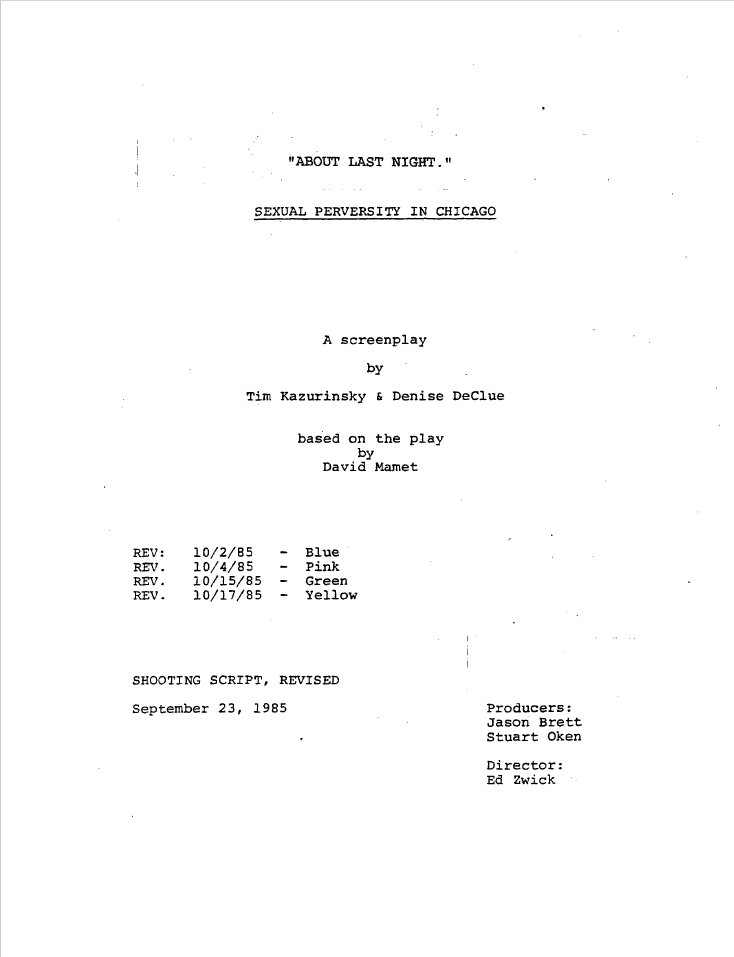 ABOUT LAST NIGHT..TIM KAZURINSKY-DENISE DECLUE..REV 10-17-85