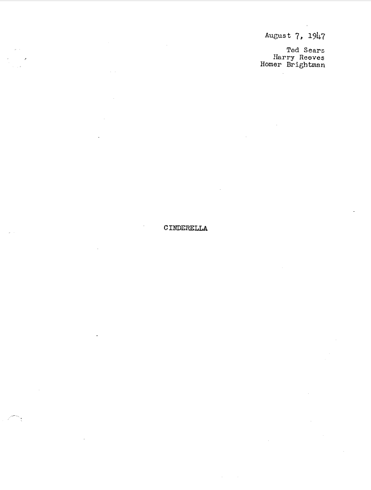 CINDERELLA (DISNEY ANIMATED)..TED SEARS-HARRY REEVES-HOMER BRIGHTMAN..8-7-47 (MISSING PAGES 1,2,3, & 44)(INCLUDES MEMORANDA STORY APPROACH BY BILL WALSH)